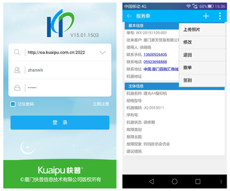 移動(dòng)服務(wù)接單、機(jī)器二維碼掃描、手機(jī)拍照定位、機(jī)器新增查詢、耗材查詢、客戶新增查詢、實(shí)時(shí)庫(kù)存查詢、知識(shí)庫(kù)查詢、應(yīng)收款及對(duì)帳、移動(dòng)辦公及審批等;