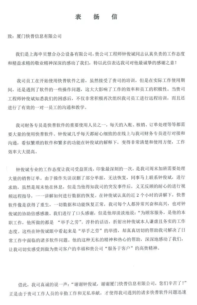 信中提到,申貝慧合財務人員是快普軟件的重要使用人員之一,每天入賬、核銷、訂單處理等等都需要大量的使用快普軟件。鐘俊斌工程師耐心細致的與其財務人員在線上對接溝通,幫助其快速順暢使用軟件,提高工作效率。