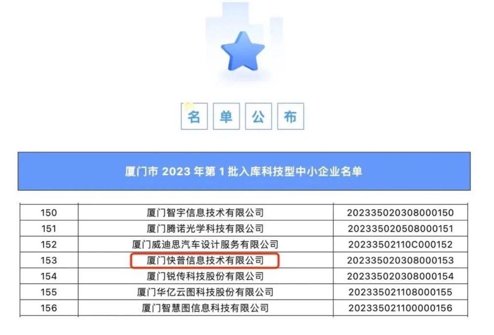 繼“廈門市創(chuàng)新型中小企業(yè)”認(rèn)定后,快普再傳捷報!近日,廈門市科技局發(fā)布了《2023年第一批入庫科技型中小企業(yè)名單》,快普赫然在列。該項評定意味著快普的技術(shù)成果、科技含量、創(chuàng)新能力等方面獲得了政府相關(guān)部門的充分肯定,同時也表明快普在科技創(chuàng)新、技術(shù)研發(fā)和知識產(chǎn)權(quán)保護(hù)方面邁上了一個新的臺階。