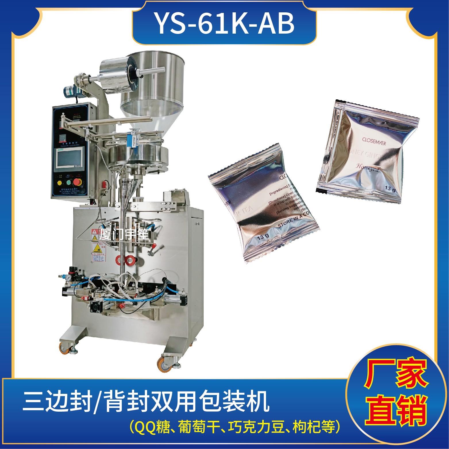YS-61K-AB 三邊封/背封雙用包裝機特點1、適用于食品、醫(yī)藥、化工、化妝品行業(yè)中顆粒物品的計量包裝。2、可自動完成制袋、計量、下料、封合、分切、計數(shù)、且可根據(jù)客戶要求配置打印批號等功能。3、觸摸屏操作,PLC 控制,驅(qū)動步進電機控制袋長,性能穩(wěn)定、調(diào)整方便、檢測準(zhǔn)確。智能式溫控儀,PID調(diào)節(jié),保證將溫度的誤差范圍…